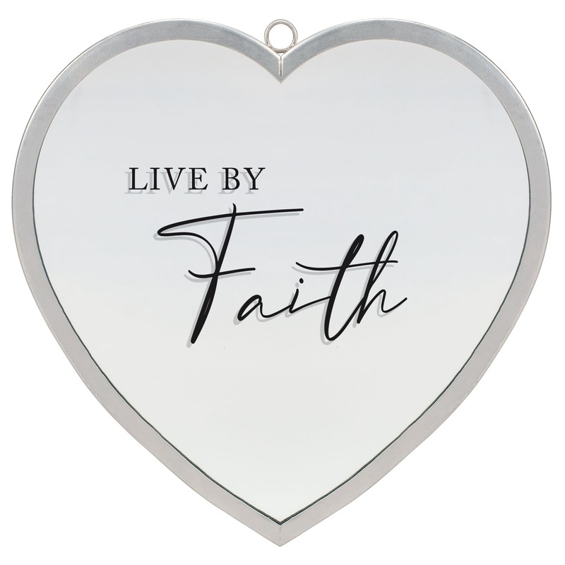 - Heart shaped mirror features sentiment reading "LIVE BY Faith"