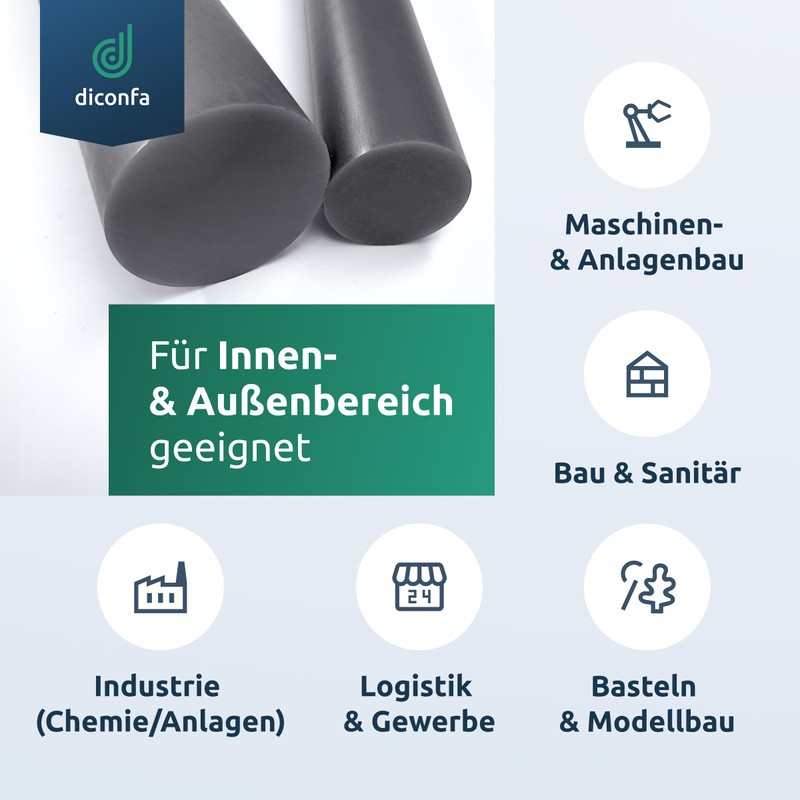 - Material: PVC plastic rod, dark grey, approx. RAL 7011 // Further processing (recommended with cooling): turning, milling, sawing, welding, drilling. Suitable for indoor and outdoor use.
