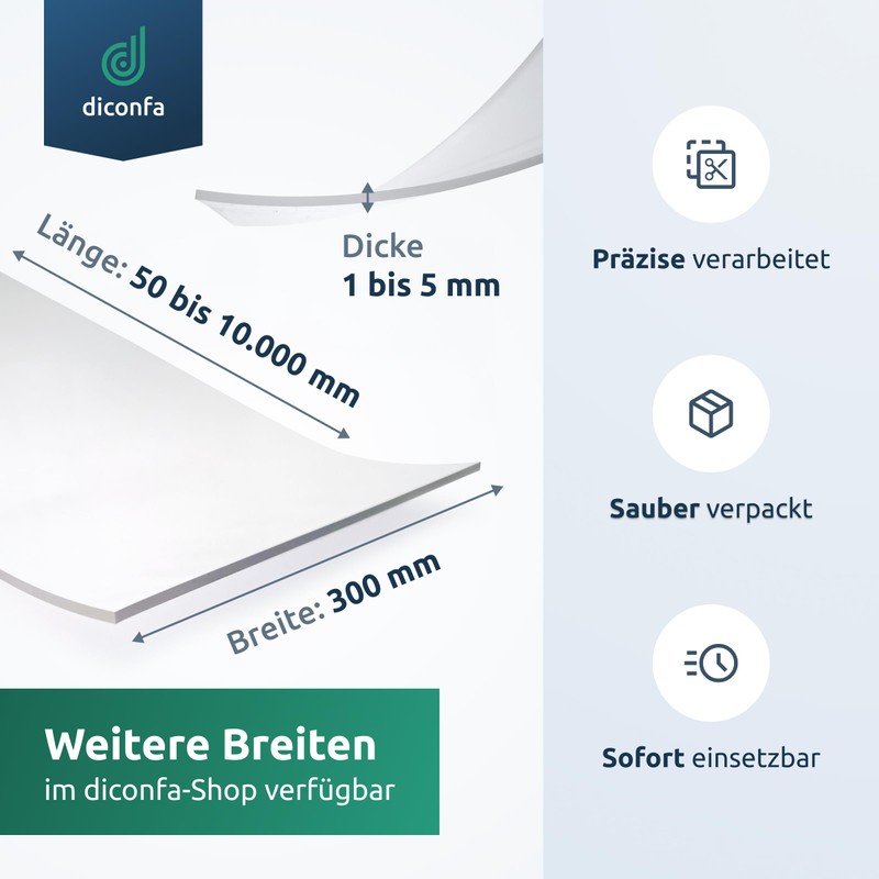 - Selection: PVC mat / PVC strip 300 mm (0.3 m) wide - thickness: 1 mm - length: 300 mm (0.3 m) - choose the required dimensions via "material" (thickness) / "size" (length).