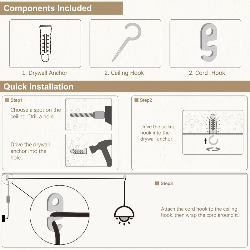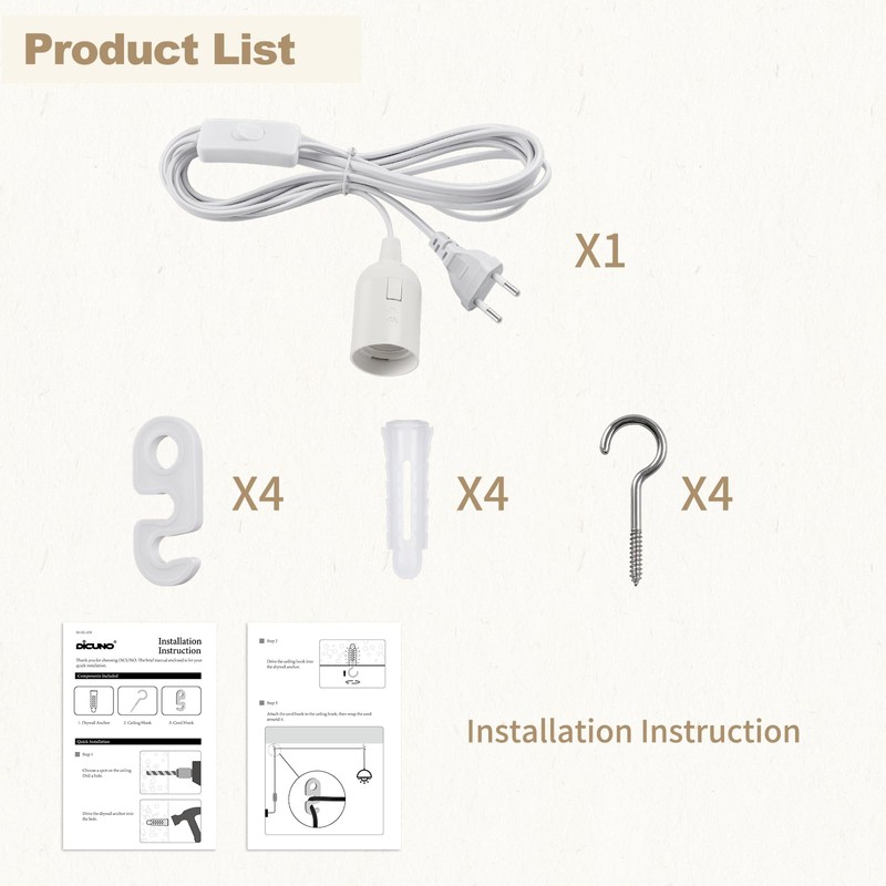 - ?Einfache Installation DiCUNO E27 Sockel mit EU Stecker, Kabel und Schalter ist ein fertige Set und erfolgt die Installation schnell und ohne zus?tz?iche Werkzeuge. Das Set beinhaltet alles Notwendige Zubeh?re fr die Montage - Spreizdbel; Deckenhaken; Kabelbhaken sowie eine Kurzeanleitung.