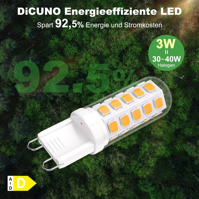 - ✦【Energieverbrauch】 DiCUNO G9 LED 3W ist eine hocheffiziente LED-Lampe, die bis zu 92,5% Energie spart und somit die Stromkosten reduziert. Mit einer Lebensdauer von bis zu 25.000 Stunden werden auch die Kosten für den Austausch der Birnen reduziert. Flackerfrei und ohne Strobe-Effekt schützt sie Ihre Augen vor Lichtschäden und schafft eine angenehme Atmosphäre.
