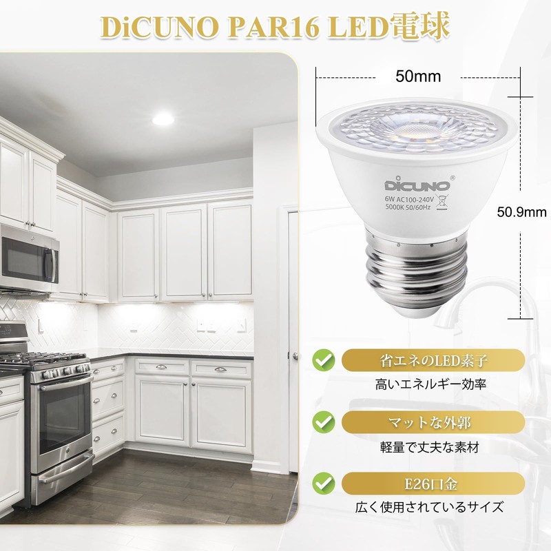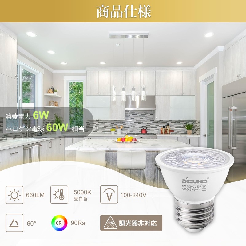 DiCUNO LED Bulb, E26 Base, Spotlight, Daylight White, 6W, 60W Halogen Equivalent, LED Spotlight, 5000K, 660lm, Wide Angle, 60°, High Brightness, Ra90, AC100-240V, Non-Dimmer, PSE Certified, Pack of 6