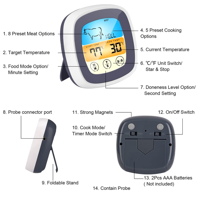 1*Digital Meat Thermometer(No include 2 AAA batteries)