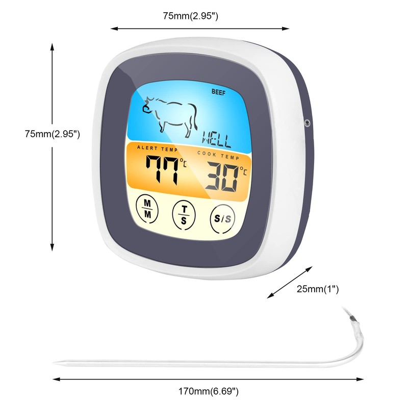- Easy to Use: The back cover comes with a stand and two small magnets for attaching to iron furniture and for standing up. You can attach it to your fridge, oven or place it on a table with the stand. Touchscreen design makes the digital meat thermometer easier to operate. The large backlight function allows the screen to clearly display the measurements, making it easy to get readings in low light conditions or in bright outdoor light. Small, lightweight and easy to store and carry, it's great for the home kitchen or outdoor barbecue!
