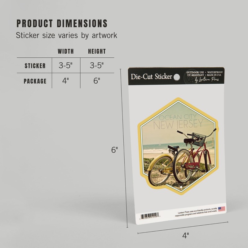 - Die Cut Sticker Ocean City, New Jersey, Bicycles and Beach Scene, Vinyl Sticker 3 to 6 inches, (Waterproof Decal for Cars, Water Bottles, Laptops, Coolers), Large, Intended for permanent placement.