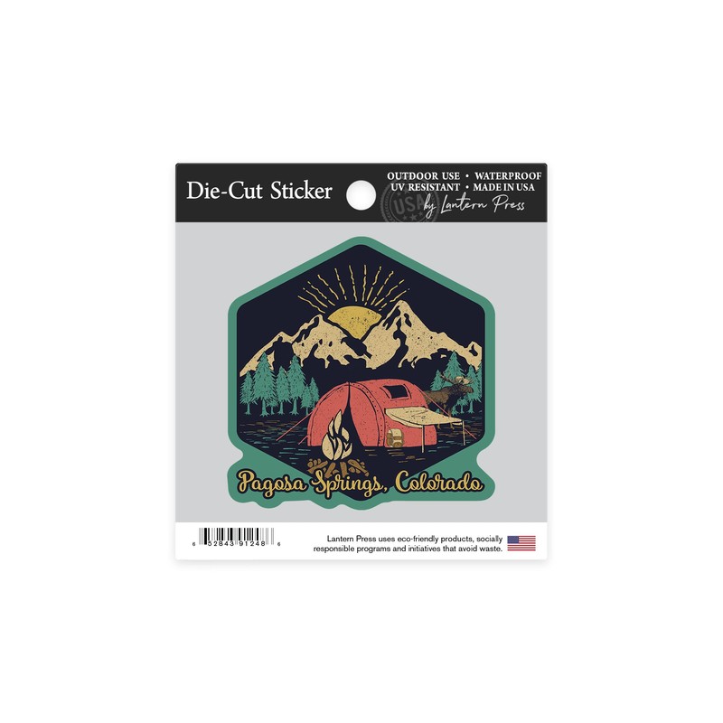 - Die Cut Sticker Pagosa Springs, Colorado, Camping Scene, Contour Vinyl Sticker 1 to 3 inches (Waterproof Decal for Cars, Water Bottles, Laptops, Coolers), Small, Intended for permanent placement.