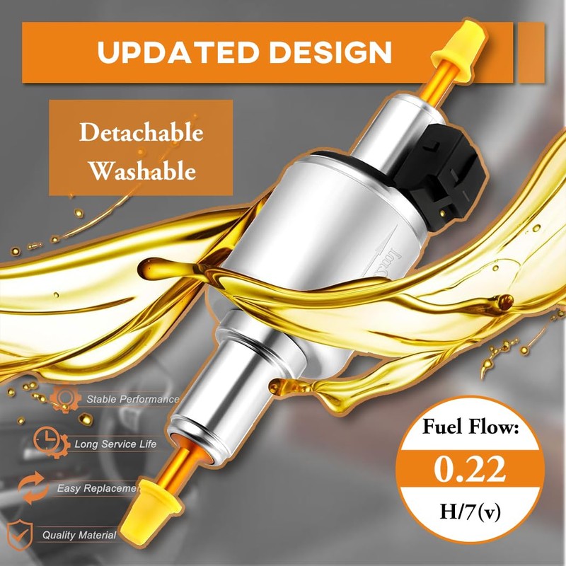 - Advantages: 12V/ 2A / 22ml diesel heater fuel pump is constructed with high-strength materials for durable, flawless operation. It delivers precise fuel metering with ultra-low noise and power consumption, while featuring a removable/washable design—providing a more comfortable driving experience.