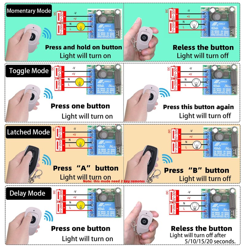 - Easy to use: Extremely easy to set up and reset. 4 operating modes (Momentary/Toggle/Latched/Delay Mode) can be programmed. You can easily program yourself according to your needs. The operating mode of the product is adjustable. This item has already been set up in toggle mode.