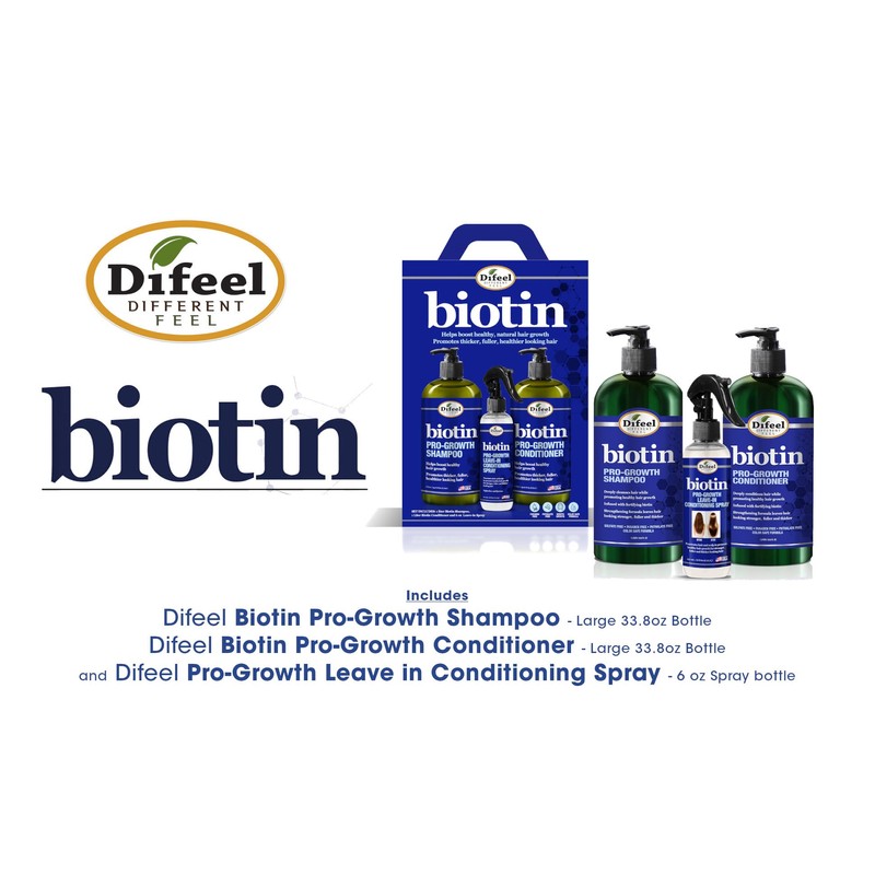 - This deluxe 3-PC Boxed Set Includes our Difeel Pro-Growth Biotin Shampoo 33.8 oz., our Difeel Pro-Growth Biotin Conditioner 33.8 oz., and our Difeel Pro-Growth Leave-in Conditioning Spray 6 oz.
