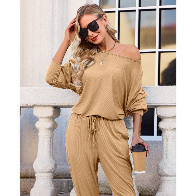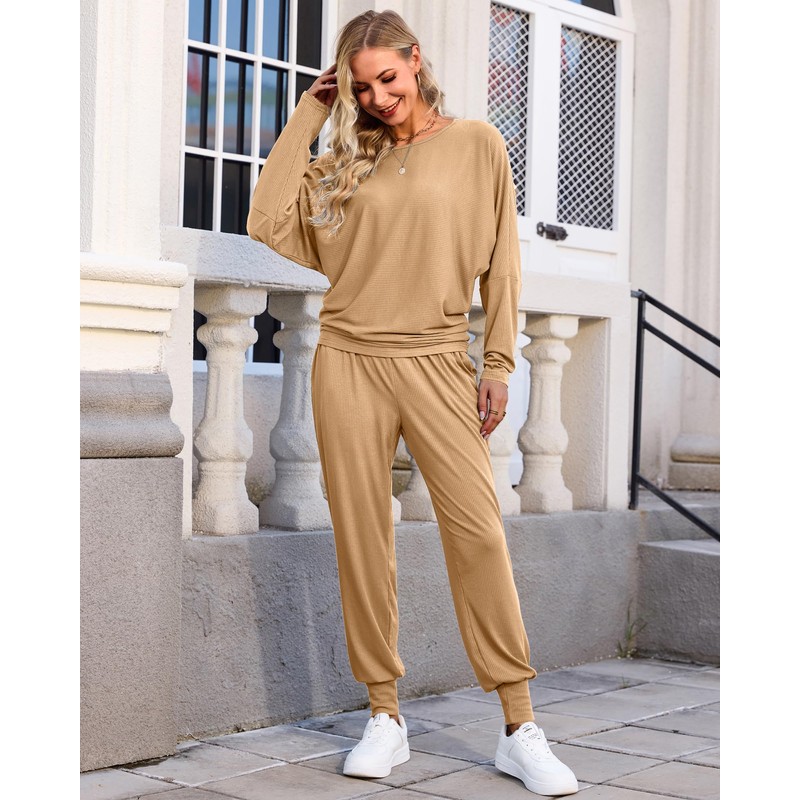 -Casual lounge wear set, Multiple colors available, boat neck top and long batwing sleeve fully show the charm of women, Elastic waistband let you relax and comfortable, 2 Pockets easy to hold small things, like change, keys or phone.