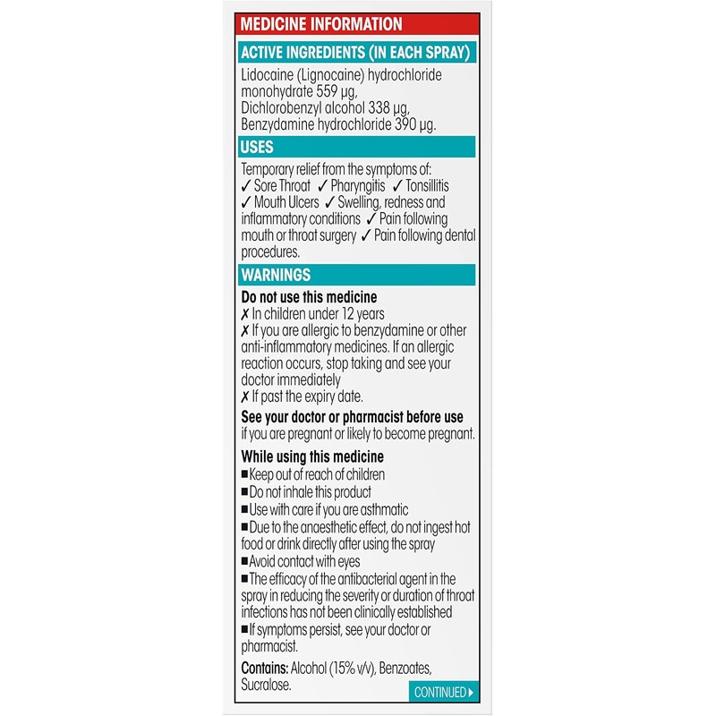 - Spray has a triple action antibacterial + anti-inflammatory + anaesthetic formula