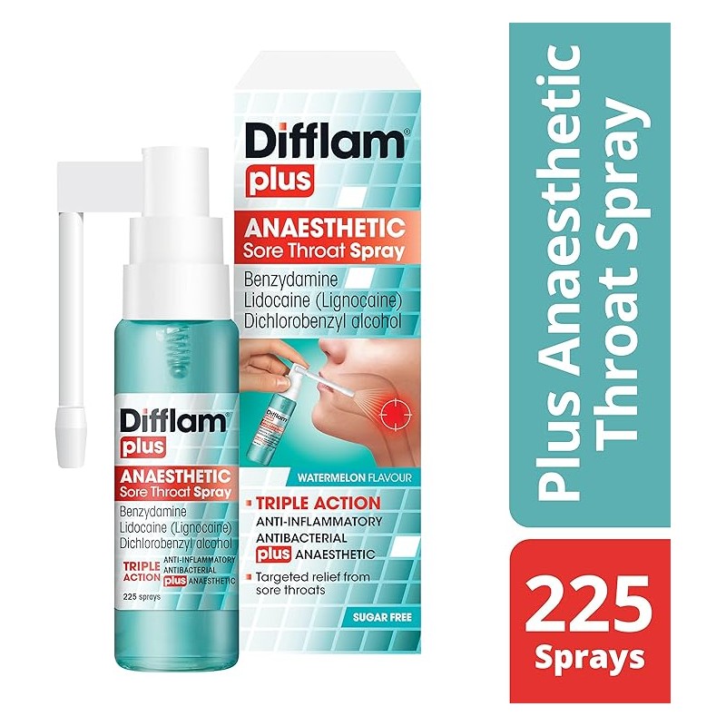 Difflam plus sore throat spray watermelon has a triple action antibacterial + anti-inflammatory + anaesthetic formula for fast numbing relief of a sore throat. Relieves symptoms of sore throat, pharyngitis, tonsillitis, mouth ulcers, swelling, redness and inflammatory conditions, pain following oral surgery, radiation mucositis and pain following dental procedures. Sugar free, lactose free, gluten free. Easy to use and carry in bag.