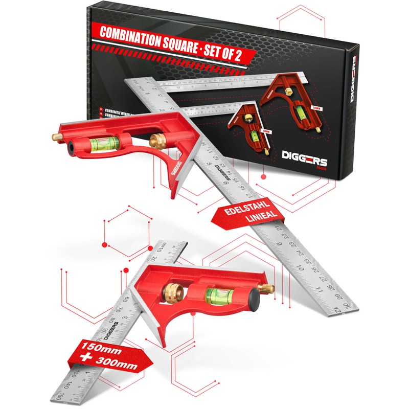 Diggers Tools Combination Square Set 150 mm & 300 mm [Precise 45/90° Angle] Metric Universal Combination Angle with Stop - Versatile Stop Square Metal with Spirit Level - Combination Square