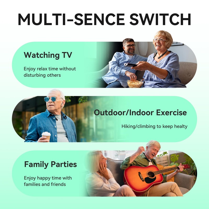 - 2 in 1 Bluetooth Hearing Aids: Hearing amplifier aid with Bluetooth can seamlessly transform into Bluetooth headset that auto-switches with ease. Suitable for watching TV, listening to music, hiking, traveling, running, etc