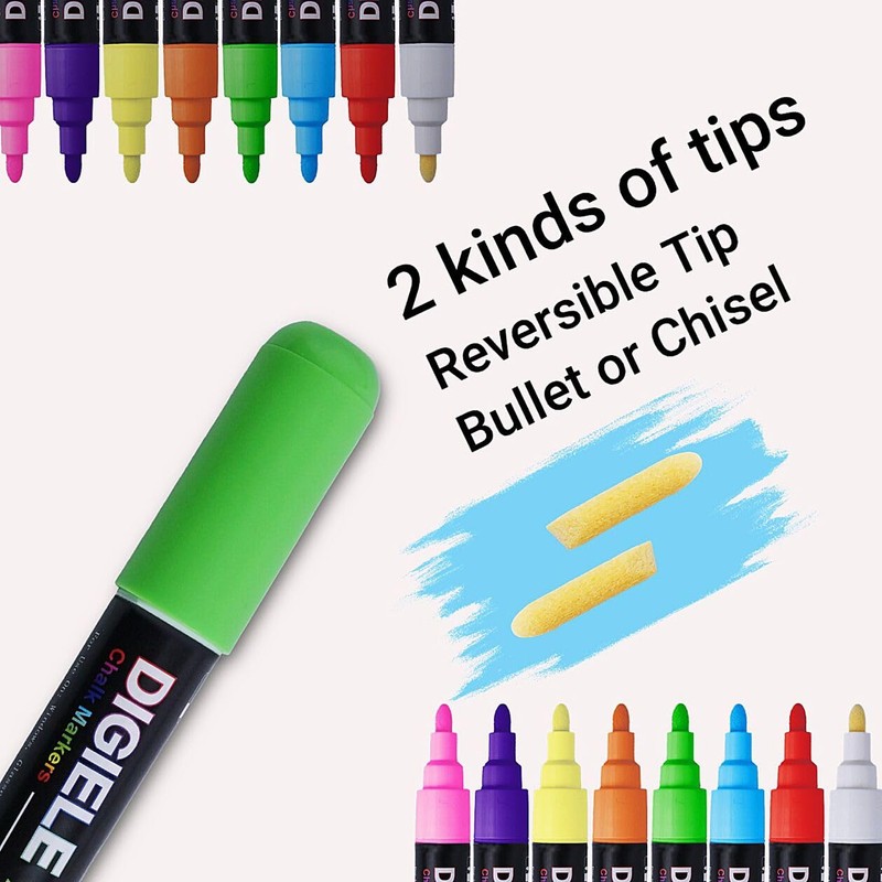 DIGIELE Chalk Pens for Windows, Glass and Mirrors, 8 Colours Chalk Pen, 6 mm Reversible Pen Tip, Dry or Wet Wipe Liquid Chalk, Non-Toxic Ink for All Non-Porous Surfaces