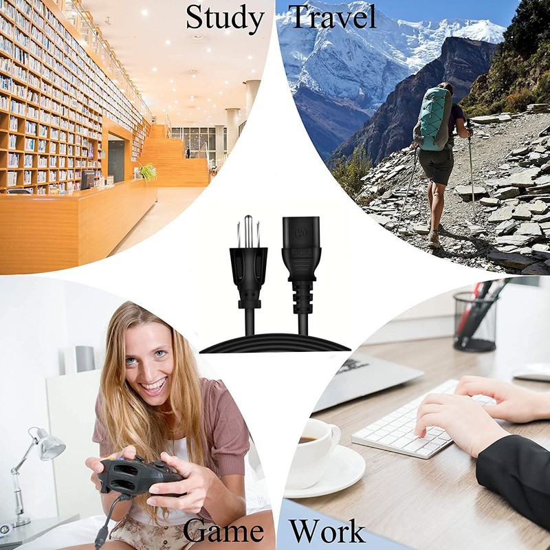- [Compatiblity]: Use this cable with laptop computers, notebooks, game consoles, printers and any other electronic devices that use a 3-prong power cord. Plugs into any US standard wall outlet.Fits into any standard outlet. Great as a replacement power cord and a second cord for travel.