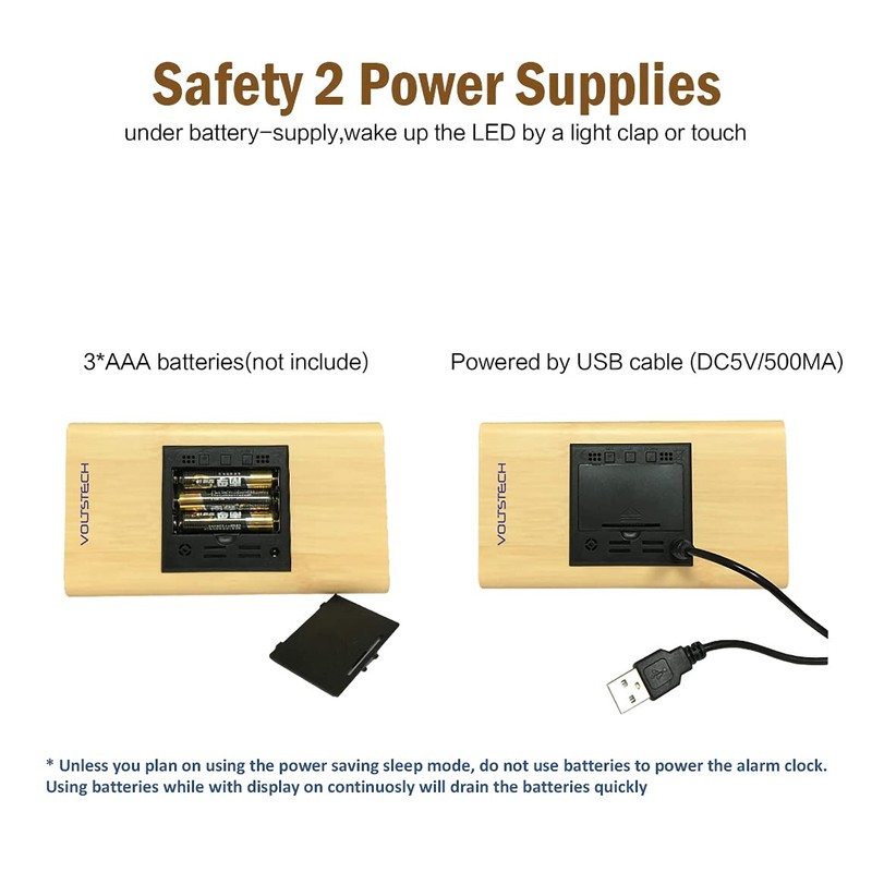 * The bedside alarm has Dual power supply capability, it can be powered with USB cable or 3 AAA batteries. If the screen is always on, a USB cable is recommended. If using AAA batteries, and the Alarm Clock is set to highest brightness setting with "Voice Mode" deactivated, the batteries will drain out quickly