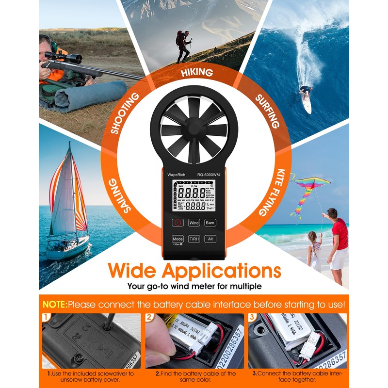 - 📲【Touch Screen & Rechargeable】Anti-interference touch button design, waterproof and dustproof, suitable for various outdoor activities such as hiking, sailing, shooting, etc. Wind Gauge built-in rechargeable battery, simply connect it to any USB power source using the included cable for easy charging.