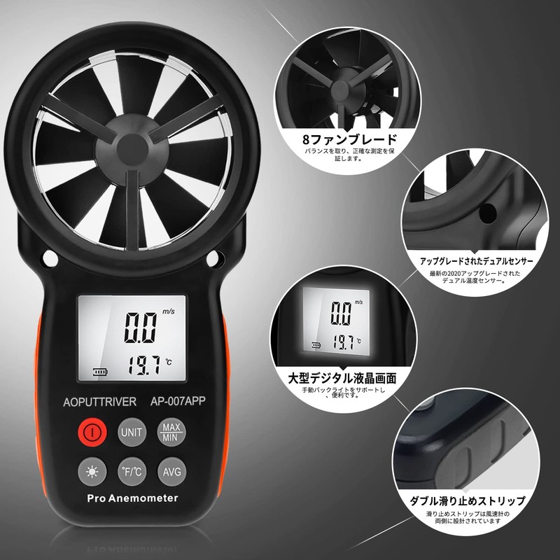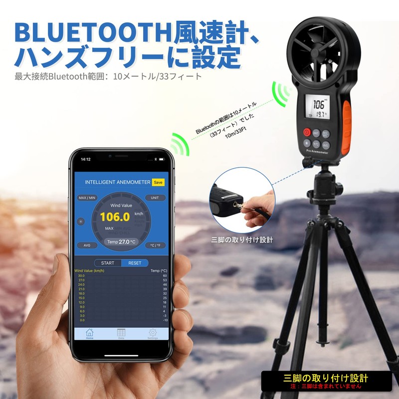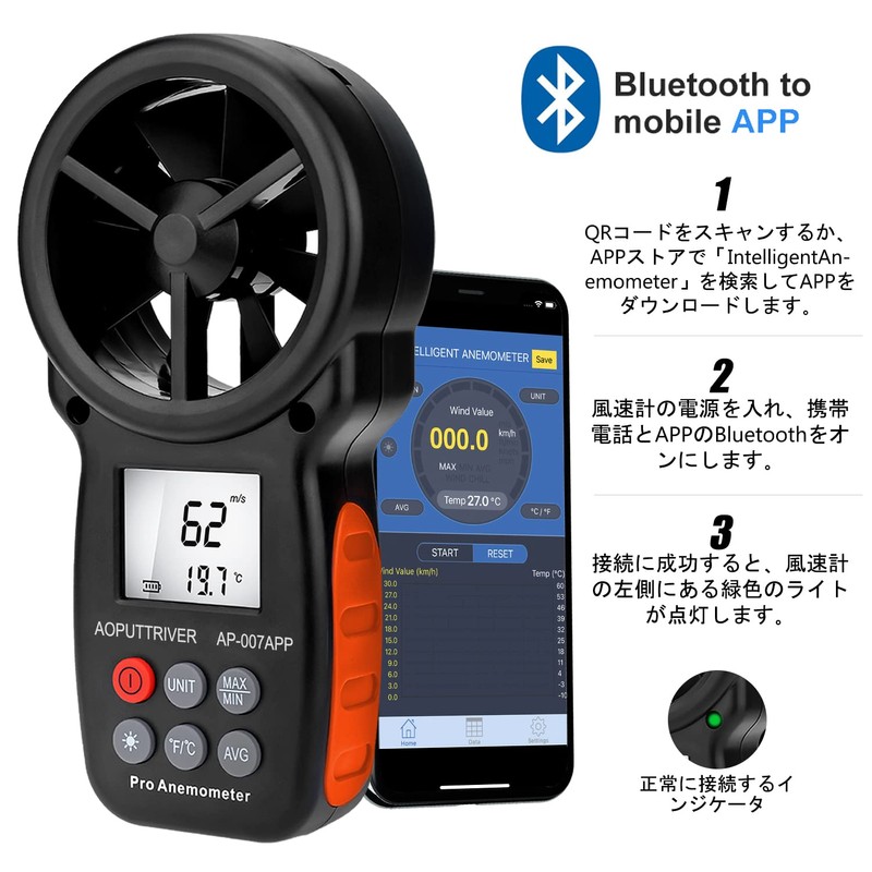 Digital Anemometer, Wind Anemometer, Bluetooth Connection, APP Connection, Handheld Anemometer, Thermometer, Backlight, Auto Off, Drone, Japanese Instruction Manual Included