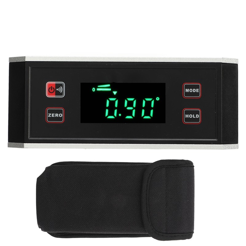 1、V GROOVE MAGNETIC BASE: Digital angle gauge's magnetic V groove base can be firmly connected to black metal surfaces such as pipelines, steel structure frames, metal manufacturing, etc. 2、ABSOLUTE AND RELATIVE MEASUREMENT: Digital angle finder has an absolute angle measurement function, which can test whether the working surface is on a horizontal plane to check roof slope, wheel alignment, etc. In addition, the magnetic horizontal plane can be used to check the relative angle between surfaces. 3、LCD SCREEN: Digital protractor has a large backlit LCD screen. Regardless of the light, you can easily read the measurement results. When the electronic level is inverted, the displayed value will automatically reverse. When you arrive 0 ° or 90 °, sound signals are emitted through a beep sound. 4、IP65 WATERPROOF AND DUSTPROOF: With IP65 protection, this inclinometer is suitable for harsh environmental conditions. The battery cover and other highly sealed structural designs ensure good operation in environments with splashing water and dust. 5、WIDE APPLICATION: Digital inclinometer is suitable for decoration, woodworking, architecture, masonry, machinery, automobiles, etc.