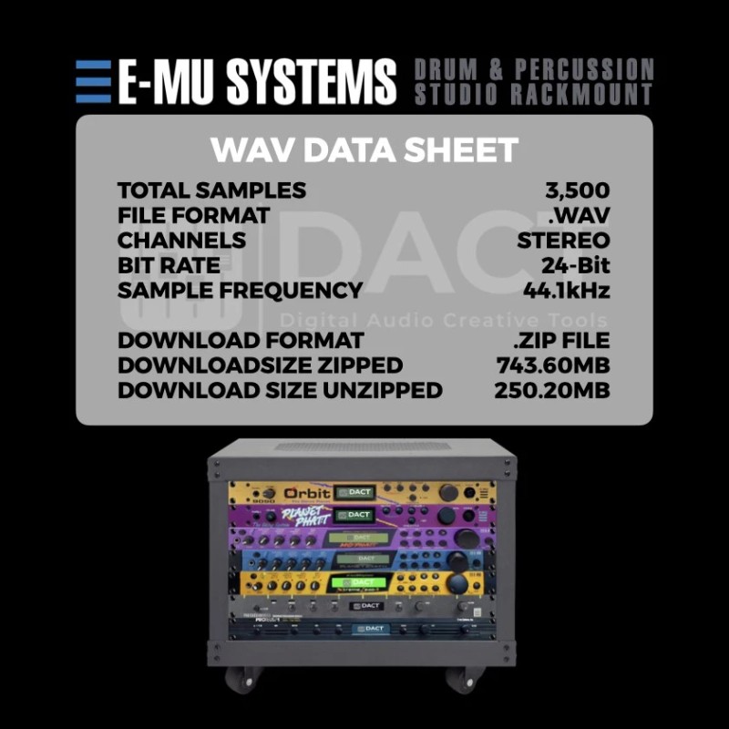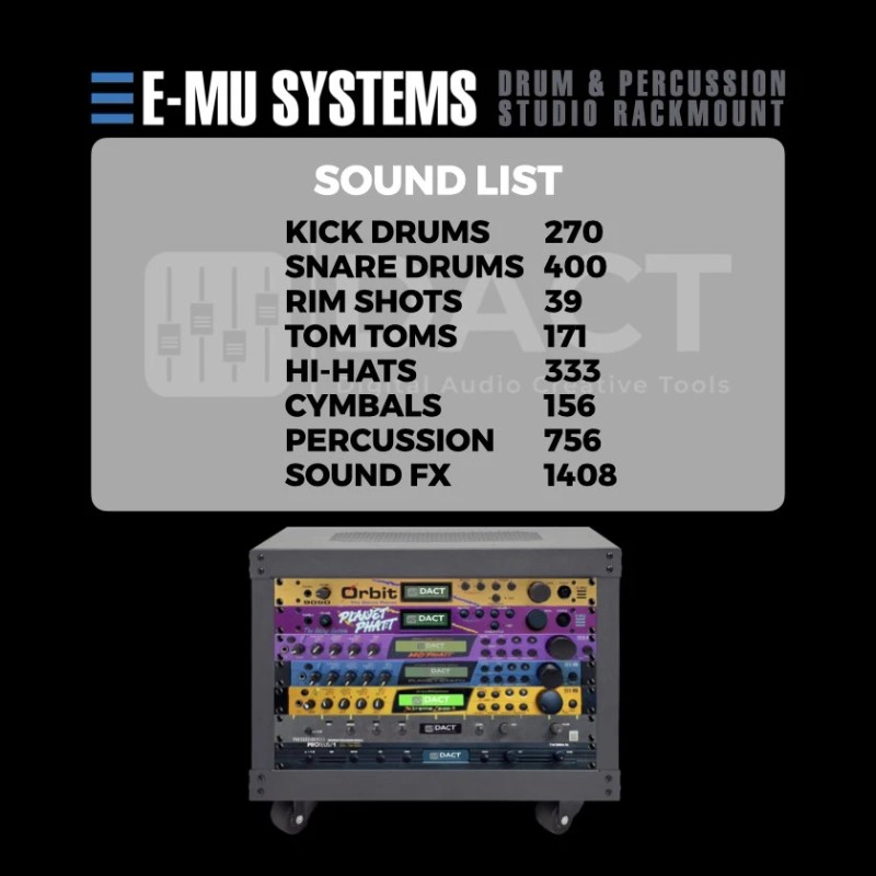 A pro-recorded library of 3,500 high quality audio files sampled from the E-MU Orbit 9090, E-MU Planet Phatt, E-MU Mo Phatt, E-MU Planet Earth, E-MU Extreme Lead, E-MU Pro/Cussion, and E-MU Proteus rack mounted drum modules. Please refer to the product photos for more information about the content of this collection.