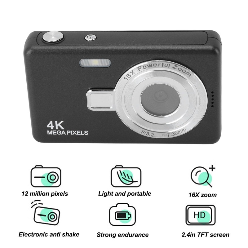 Digital Camera, 12 MP 1080P Camera with 16x Zoom, One Button Operation, 2.4 Inch TFT Screen, for Students Vlogging (Black)