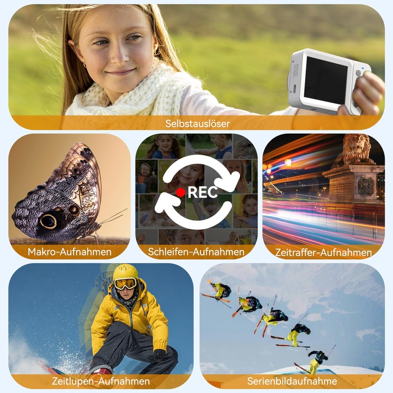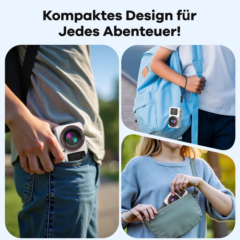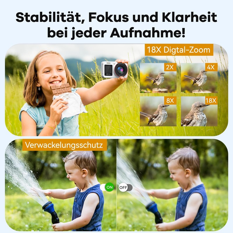 - Portable design and long battery life: the lightweight and compact body of this digital camera is ideal for travel and daily use. With two rechargeable batteries and a high-capacity 64GB memory card, you don't have to worry about energy or storage space – so you can capture every special scene without interruption. Whether close-ups or wide-angle moments, this digital camera allows you to enjoy maximum freedom and recording quality.