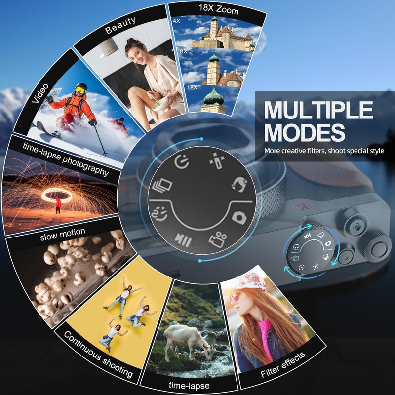 - 【18X Great Cameras for Photography】The vlogging camera supports 18X digital zoom, video pause, recording while charging, loop recording, continuous shooting, beauty function and selfie. Adopting the latest upgraded chip to ensure higher definition and more realistic camera images. Especially the beauty feature, it can help you catch the attention of others and win more likes on social media platforms at once.This is the best for friends and family.