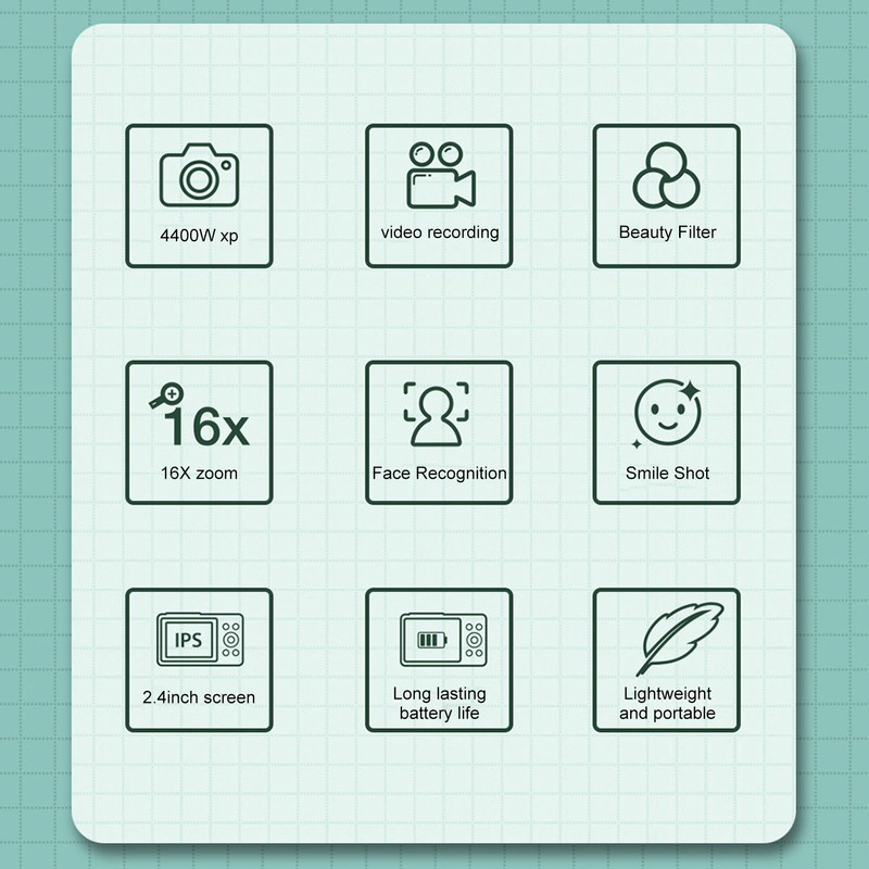 1、High Definition Photography: The digital camera can shoot 44MP photos and 1080P video output for ultra clear and vivid images. Rich in detail and accurate color reproduction, with support for 16x digital zoom. 2、One Click Shooting: Supports automatic light sensitivity, adaptive shooting modes, and electronic image stabilization. No need for complicated settings, even beginners can easily take professional quality photos with a simple press of the shutter button. 3、HD IPS Screen: Equipped with a high definition IPS display screen that is scratch resistant and durable. Provides clear visibility of the current shot content for easy operation. 4、Auto Focus: Supports face and smile detection, automatic beauty enhancement, and multiple color filters. Combined with the autofocus function, the camera is always prepared for shooting every exciting moment without the need for manual focus adjustments. 5、Versatile Applications: Equipped with a large battery to ensure sufficient power, this camera can meet various shooting needs. Whether it's for outdoor travel, friend gatherings, graduation photos, wedding ceremonies, or capturing every moment of growth, this compact camera handles all your shooting scenarios effortlessly. 6、Compact and Adorable: Despite its powerful features, this digital camera remains lightweight and compact, allowing for easy one handed grip and convenient pocket storage. Its unique and stylish appearance showcases your unique charm and also makes for a great gift choice for friends and family.