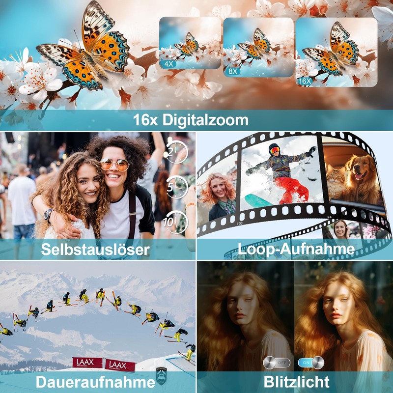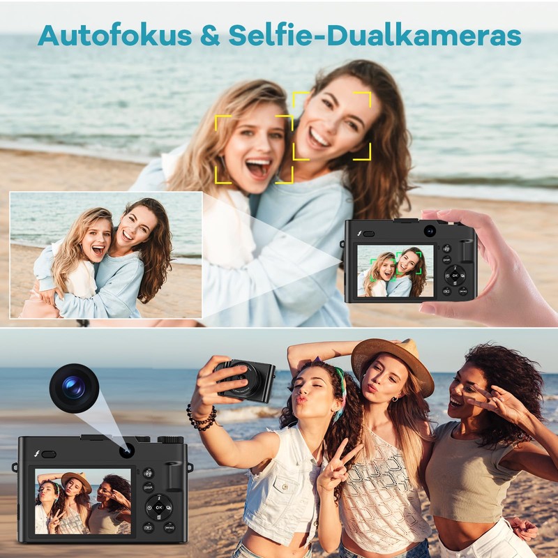 - Beginner-friendly operation & perfect gift design: Clear menu navigation, one-handed operation and plug-and-play setup make this digital camera the ideal companion for teenagers, photographers and creative content creators. Complete in a stylish gift set with 2 batteries, 32 GB TF card, a strap and USB-C cable, perfect for birthdays, holidays or as a graduation gift. Our customer service is there for you 24/7 to help you with any questions or concerns.