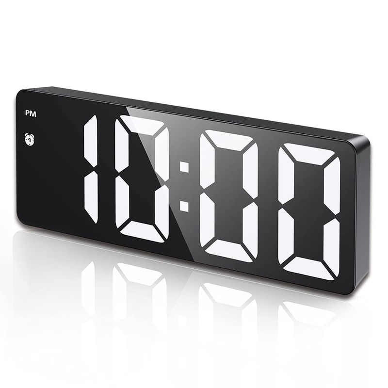 - LARGE DISPLAY AND MULTIFUNCTIONAL: The digital alarm clock adopts a large LED display (6.3"x0.7"-1"x2.36") so you can check the time at a glance even when you are far away. 5 Modes of Smart Clock: Clock Mode, Date Mode, Temperature Mode, Night Mode (On/Off), Alarm Mode The back button is easy to describe and easy to set up