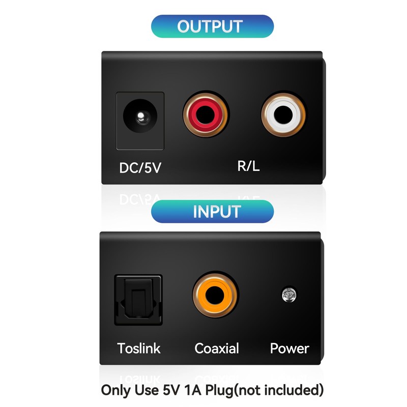 **Specifications:** It converts Coaxial or Toslink digital audio signals to analog L/R audio . This Converter has many features that enable it to perform in a superior manner. Converts Coaxial or Toslink digital audio signals to analog L/R audio Supports sampling rate at 32, 44.1, 48 and 96 KHz. 24-bit S/PDIF incoming bit stream on left and right channels Provides electromagnetic-noise-free transmission. Easy to install and simple to operate. Input Audio: Coaxial or Toslink digital audio Output Audio: L/R audio Input audio connector: Toslink、1XRCA(Coaxial) Output audio connector: 2XRCA(R/L) Operating temperature:0~70°C Operating humidity:10%~85%RH(no condensation) **External power supply:5V DC/1A or 5V DC 2A (Power supply not include)** Dimension: 51 x 41 x 26 mm Color:Black Weight:90 g Package weight:100 g **Note:** 1\. Please don't forget to set the audio output to PCM or LPCM as it is not compatible with 5.1 Channel Signal, such as Dolby Digital or DTS 5.1, Dolby- AC3. 2.Set your TV's Audio Output to the PCM/LPCM Format. (Steps: Device homepage-- system setting--image and sound---voice setting--digital audio output-- PCM/LPCM). 3.PS4 Pro and PS4 Slim can not use this converter as they haven't Optical fiber output interface. 4.For Samsung TV, if there is no sound even you set the audio output to the PCM/LPCM format, please turn on the TV external speakers (Menus-Sounds- Speaker Setup- HESB/external speaker-ON) 5.For Panasonic TV as audio resource, please set TV audio output to SPDIF output. **Package Included:** 1 x Digital to Analog Audio Converter Adapter 1 x fiber Optical cable(99cm length) 1X 1 x USB Power Cable 1XRCA cable 1XEnglish manual **NOTE: (excluding 5V DC power supply)**