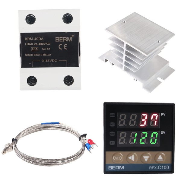 Digital PID Temperature Controller REX-C100 PID Thermostat Temperature Controller Digital REX C100 with 40DA SSR Relay K Thermocouple Probe RKC and Silver Heat Sink