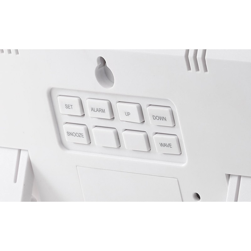 - Current date with day of the week, LCD radio wall clock with jumbo time, temperature and date display, display of the interior temperature from -9.9 to +59.9 °C or 14.8 to 139.8 °F. Alarm clock function with snooze button. Colour: white.