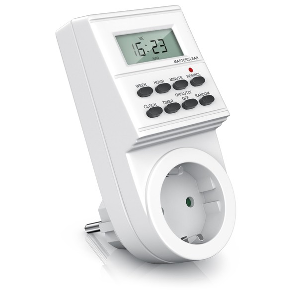 - Input voltage: 230 V ~ 50 Hz, maximum load: 16 A, 3680 W, minimum setting time: 1 minute, with integrated touch protection (socket), function keys: Masterclear + week, hour, minute, res/Rcl, clock, timer, on/auto/off, random