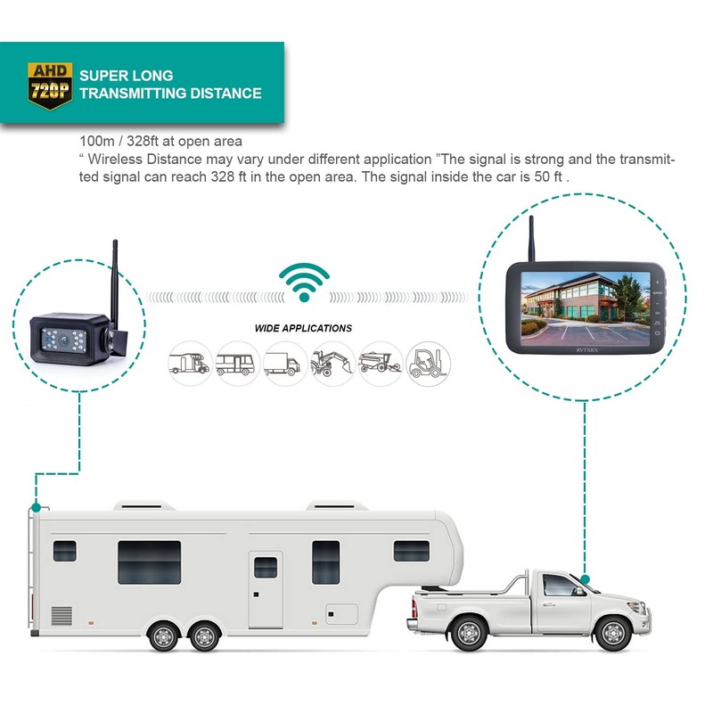 - ★New upgraded wireless backup camera system, with ideal 5inch monitor offers real higher and clearer picture quality 720P, no interference wireless signal and longer transmitting distances good for almost truck, semi-trailer, motorhome, 5th wheels, trailer, RV, Van, SUV, camping car, bus