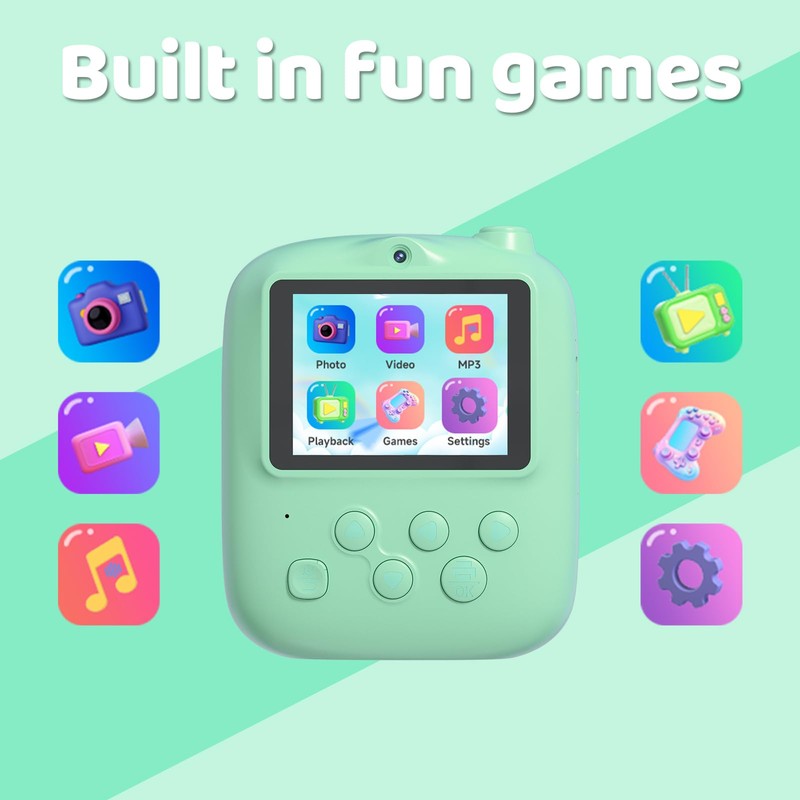 - Fun and Easy to Use: Features a 2.4-inch large screen, 16X digital zoom, instant print capability, 4 puzzle games, MP3 player, and cute photo frames. Perfect for sparking creativity and capturing joyful memories with family and friends.