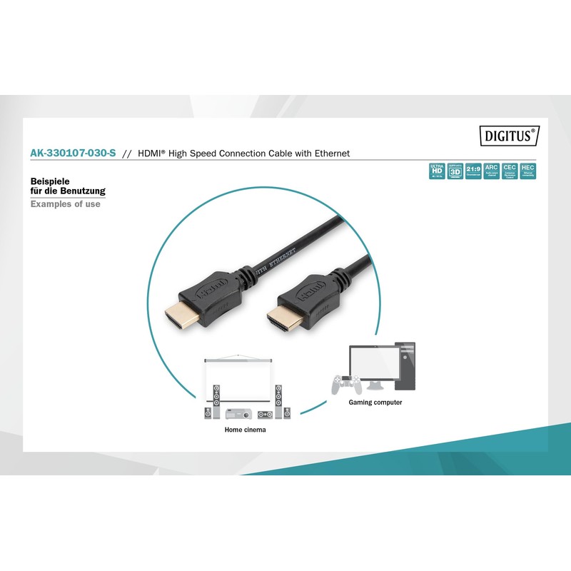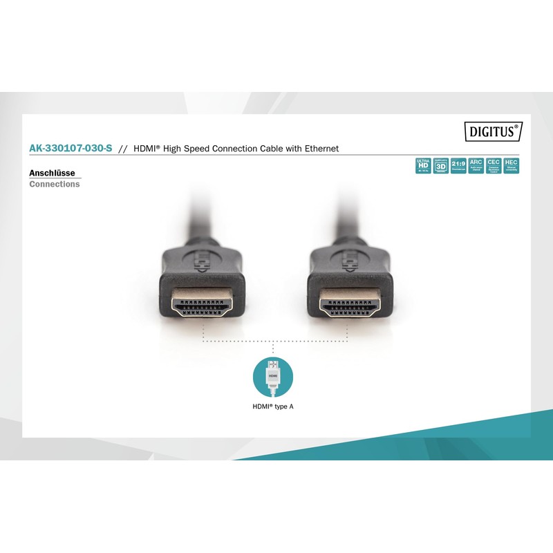 Digitus AK-330107-030-S 3.0m Type A Male - Type A Male HDMI High Speed with Ethernet Connection Cable with Gold Plated - Black