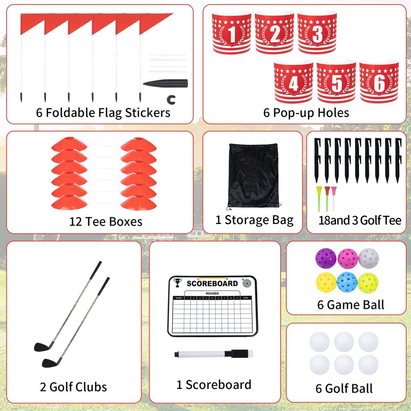 • 【Complete Accessory Package】:Our golf game set includes everything you need for an exciting match: 6 holes, 12 tees boxes, 6 game balls , 6 flags, 6 golf balls, a scoreboard, a storage bag for easy transportation and many golf tees. This comprehensive set ensures hours of fun and convenience, whether at home or on the go.