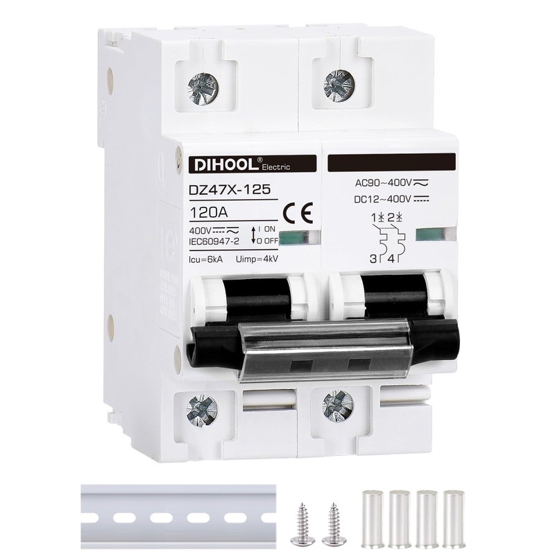 DIHOOL Solar Disconnect Switch, 120 Amp 2 Pole, DIN Rail Mount, Non Polarized, 12V 24V 48V 400V, AC/DC Circuit Breaker, RV Battery Isolator, PV Array MCB, Thermal Magnetic Trip