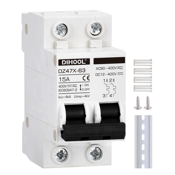 DIHOOL Solar Disconnect Switch, 15 Amp 2 Pole, DIN Rail Mount, Non Polarized, 12V 24V 48V 400V, AC/DC Circuit Breaker, RV Battery Isolator, PV Array MCB, Thermal Magnetic Trip