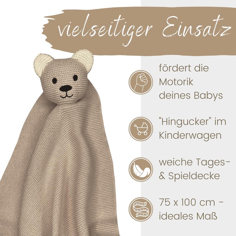 - Cuddly bear: the blanket is accompanied by an adorable knitted cuddly toy in bear shape, which is not only cute, but also a perfect cuddly blanket for the baby.