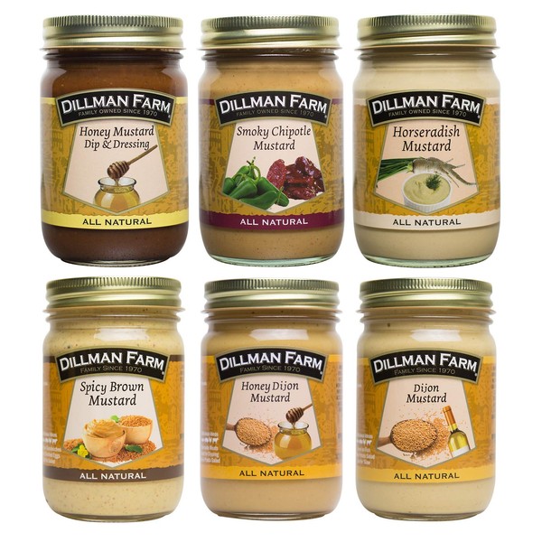 Dillman Farm All Natural Gourmet Mustard Variety Pack (6 pack) |Honey Mustard, Smoky Chipotle Mustard, Horseradish Mustard, Spicy Brown Mustard, Honey Dijon Mustard, Dijon Mustard| - Gluten-Free, Non-GMO, Vegan, Kosher, Eco-Friendly, Preservative Free, Corn Syrup Free - Made in USA, 13 oz (Pack of 6)