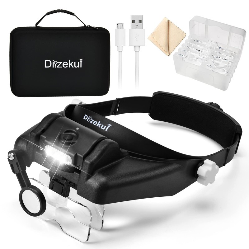 Dilzekui Magnifying Glass with Light 1X to 14X, Rechargeable Magnifying Glasses, Head Mount Manifying Glass, Headset Magnifier with Detachable Lens, Headband Magnifier for Close Work Jewelers Crafts