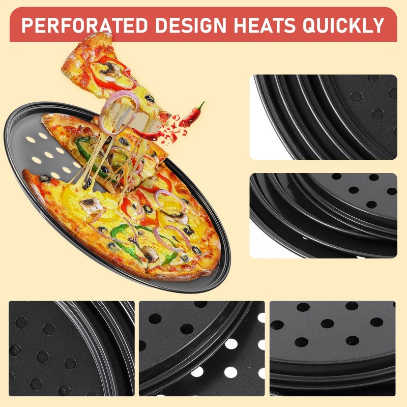 【Breathable Hole Design】The round pizza baking tray is designed with properly spaced holes to ensure excellent ventilation. The baking pans set helps to bake pastries quickly and evenly, and you can get a soft and perfectly baked crust every time