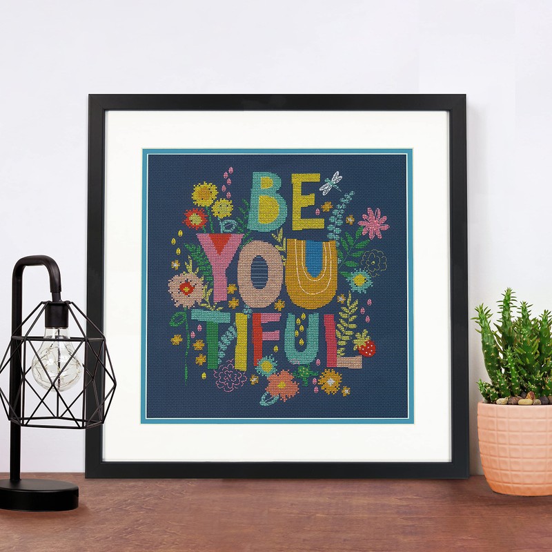 Dimensions 70-35412 Be-You-Tiful Counted Cross Stitch Kit for Beginners, 14 Cnt. Navy Aida, 11" x 11", 4pcs