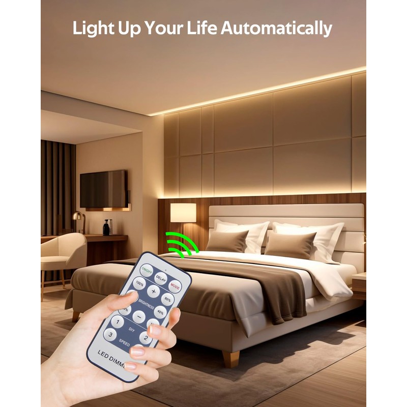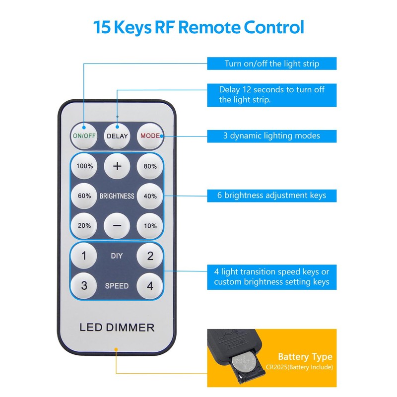 - LED light controller has a 10-level brightness dimmer (0-100%), 4 dynamic modes, 4 levels of speed adjustment and custom brightness settings. It also has a memory function, when you turn on the LED strip light again, the remote dimmer will keep the last setting memory. With the timer function, you can set the strip to delay 15 seconds to turn off.