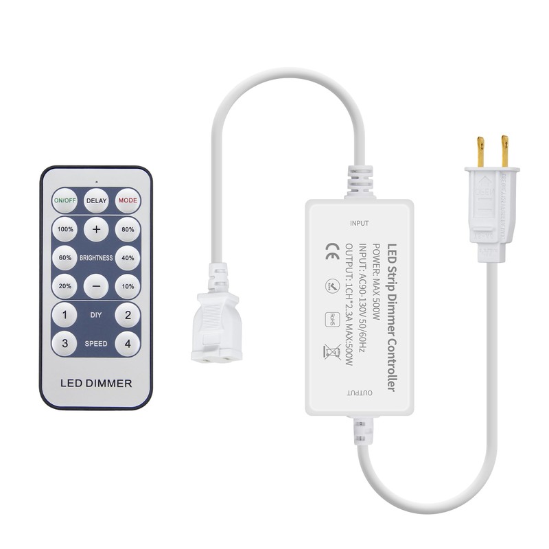 - This remote dimmer is very easy to install, just connect the plug of the AC 110V-130V led rope light power cord to the tail connector socket of the dimmer controller cord, the installation step is completed. The LED controller is not waterproof, please take waterproof measures for the controller and plug before lighting the strip.
