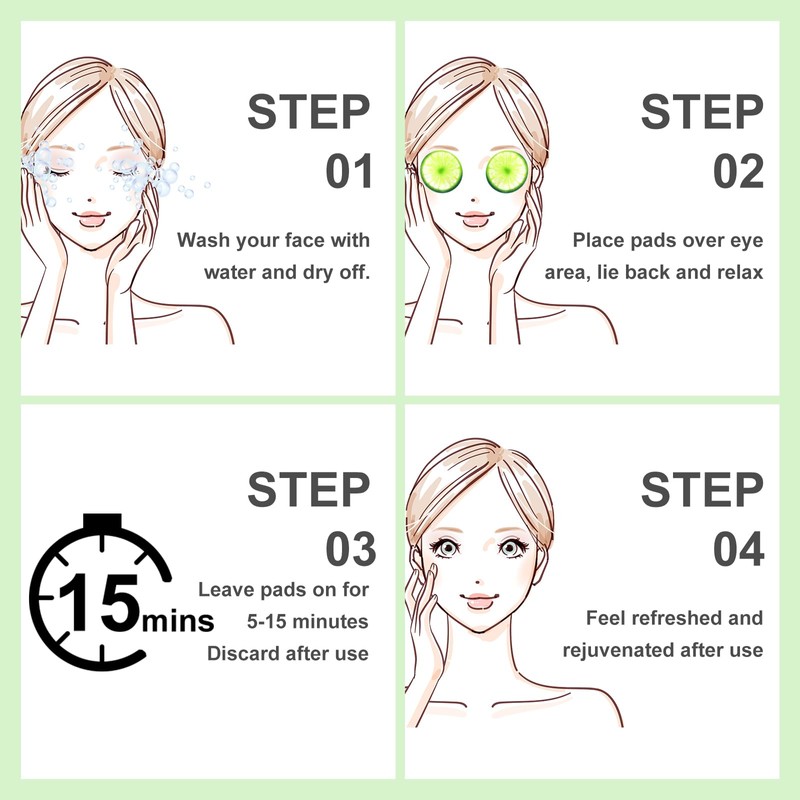 - Hassle Free Hydration Boost: hydrate your skin in the easy way with our soothing eye pads; Start with a clean face, no makeup, place the soothing cucumber eye patches in each eye area, then lie down and relax for 5-15 minutes, enjoying nourishment to revitalize your under eye area; It's an ideal solution for tired and dry skin, without mess; For an extra refreshing experience, store the soothing eye pads in the refrigerator