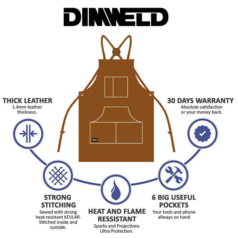 - ✔️ THE BEST FRIEND OF EVERY WELDER OR HIERRY THAT IS PRECIED - The DIMWELD apron is made to last. It is made of 1.4mm thick cowhide and sewn with heat-resistant Kevlar yarn so that you can spend many hours with it without fear of breakage or wear. It also has a cross system on the back that will prevent it from hanging on the chest section.